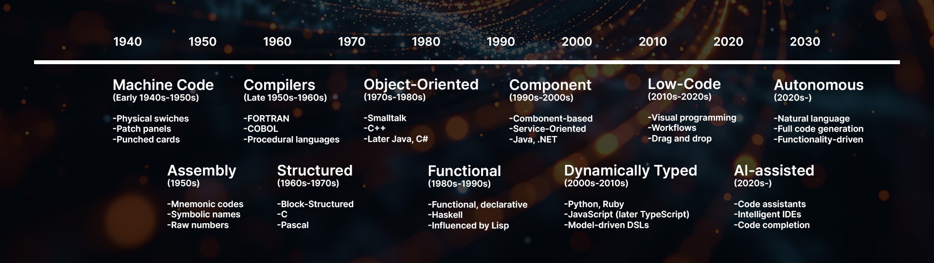 Over time, structured programming, object-oriented paradigms, functional and declarative languages, and higher-level frameworks and runtimes further abstracted away the underlying hardware. They introduced conceptual models that mirrored how developers think about problems. Domain-specific languages (DSLs) and model-driven development focused on expressing logic in terms of the business or application domain. Low-code and no-code platforms allowed solutions to be assembled visually, with minimal explicit coding.
